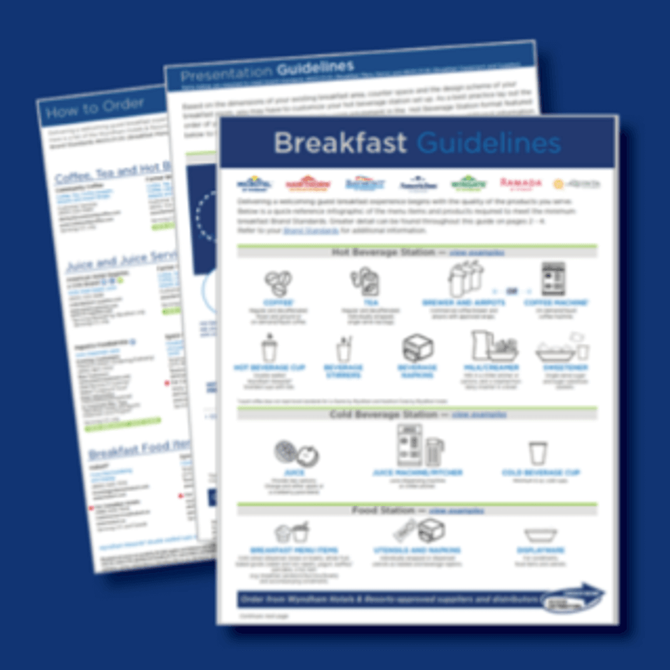Access the updated Breakfast Guidelines for either Midscale hotels or Economy hotels, and help your hotel meet Brand Standards #600.01.05 (Breakfast Menu Items) and #600.01.06 (Breakfast Equipment & Supplies).* |